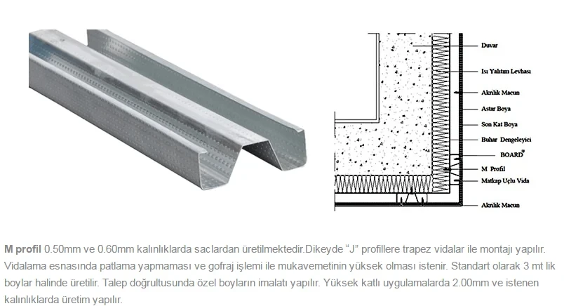 M profil galvaniz 0.45, 0.50 ve 0.60 mm kalınlığındaki saclardan üretilmektedir.Dikeyde j profillere trapez vidalar ile montajı yapılır. Vidalama sırasında patlama yapmaması ve gofraj işlemi ile dayanımının yüksek olması sağlanır. Fibercement levhaların montajı m profillere özel akıllı vidalar marifeti ile yapılır. M2 birim sarfiyatı statik hesaplara göre değişkenlik göstermekle birlikte 2,7 mt dir. Standart olarak 3 mt'lik boylar halinde üretilmektedir.